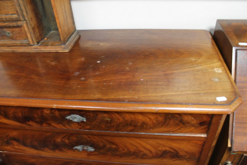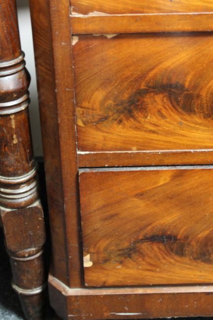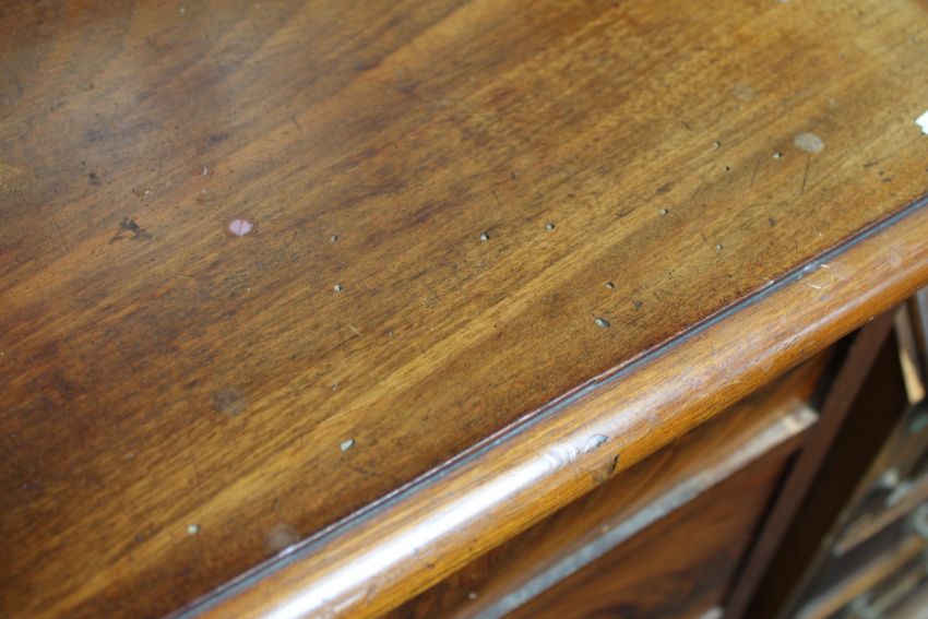 Surface wear to include scratches, scuffs and watermarks. Some small veneer losses. Losses to escutcheons. Some signs of worm to top. 90cm high, 94cm wide, 47cm deep. See images.