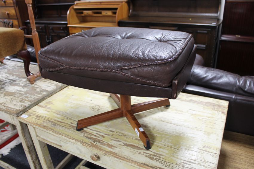 A mid 20th century brown leather footstool on rosewood base