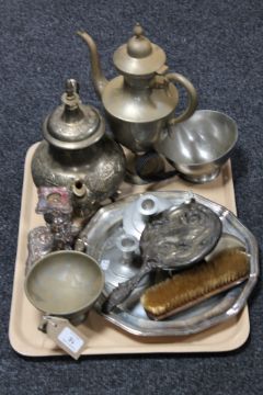 A tray of twentieth century plated ware including teapots, candlesticks, deco hand mirror etc