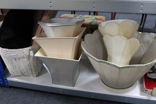 Eight assorted table lamps and shades together with a wicker log basket of rugs