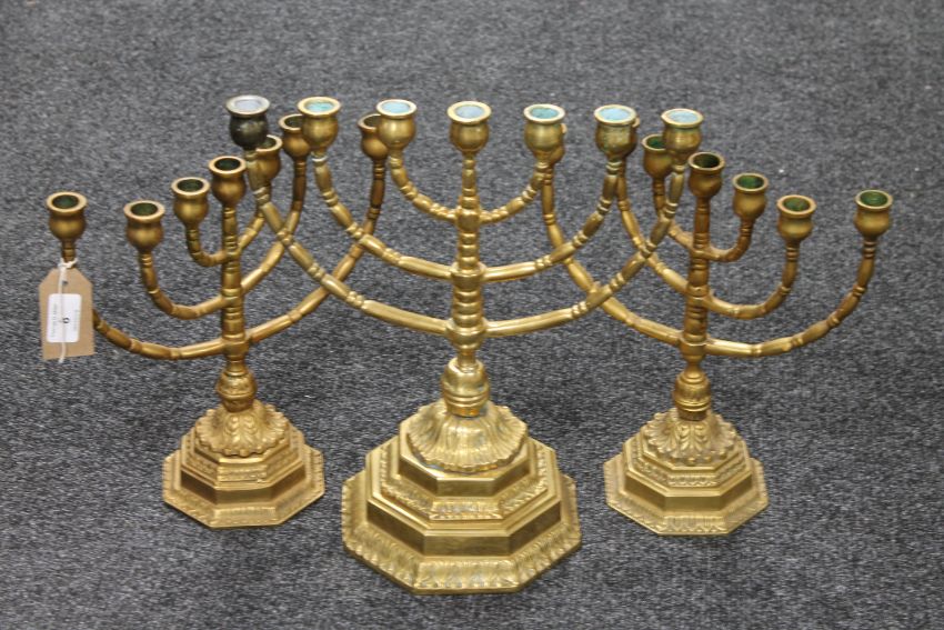 Three heavy brass menorahs on octagonal bases