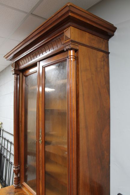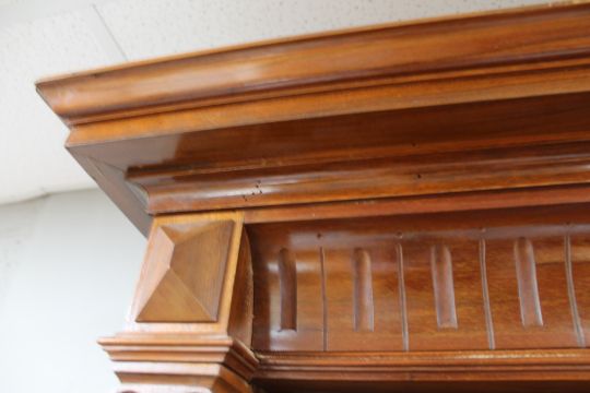 One of the back feet is missing. The front left foot is missing part of the moulded frieze. Signs of worm to the cornice. The left side door appears to be jammed in place and will not move. Typical surface wear. This measures 217cm high, 109cm wide and 52cm deep. See additional images.