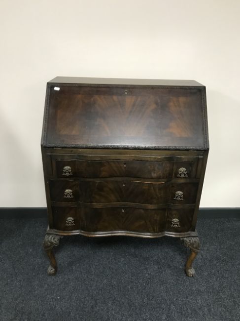 A mahogany serpentine fronted bureau on paw feet