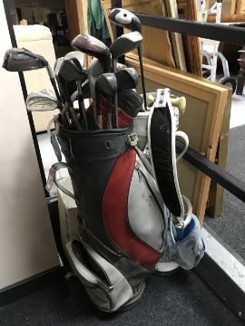 Two golf bags containing golf clubs, a box of golf club covers and golf balls