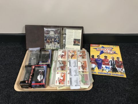 A tray containing four boxed die cast vehicles, Formula 1 cars and a James Bond Aston Martin, together with a folder containing shootout trading cards and a collection of Pobjoy Mint World Cup crowns