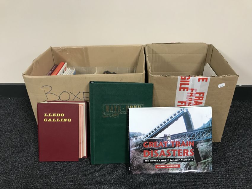 Two boxes of books relating to trains and die cast vehicles