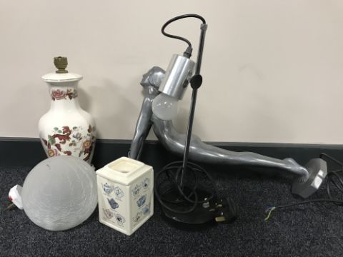 A box of Masons table lamp, mid 20th century lamp, metal art deco table lamp with shade, Ringtons tea jar etc