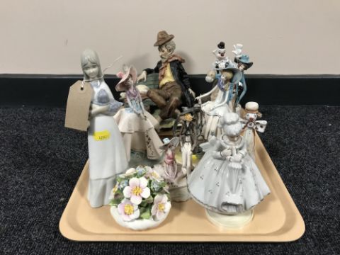 A tray of continental china figurines, Italian figure, china cat ornaments etc