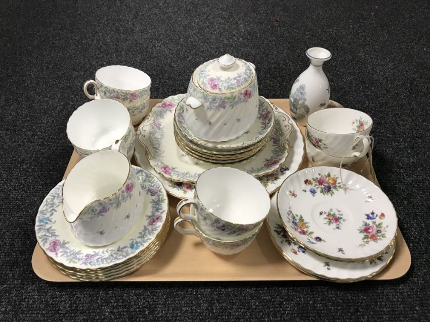 A tray of twenty one piece Minton Printemps pattern bone chine tea service, pair of Minton Marlo china trios and a Wedgwood Chinese Legend vase