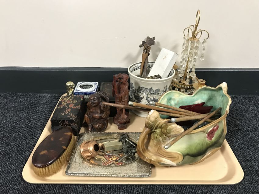 A tray containing carved Oriental figures, Oriental lacquered box, china inkwell, plated photo frame etc
