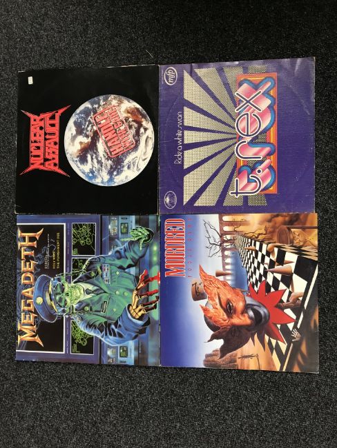 Six boxes of LP records including rock, Genesis, Thin Lizzy, Wasp, Megadeth etc and boxes of 45's singles