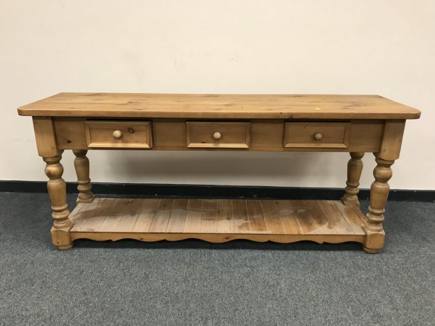 A Victorian style pine dresser fitted with three drawers, width 183cm
