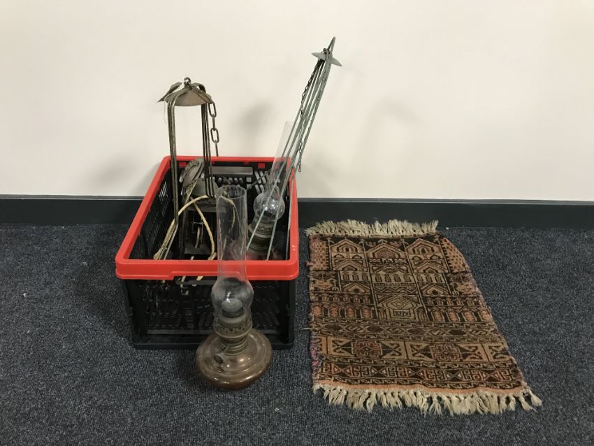 A box of brass faced wall clock, miniature prayer rug, two hanging oil lamps with glass chimneys