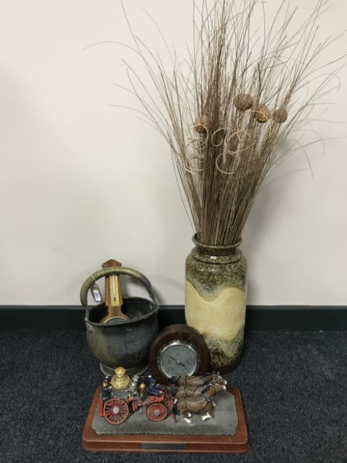 A West German stick pot with sticks, brass coal receiver, two barometers and a figure of five alarms on wooden plinth