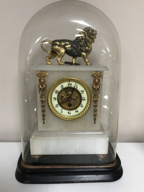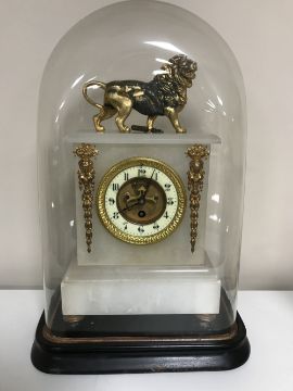 An alabaster and gilt metal mounted mantel clock, under Victorian glass dome on ebonised base with key