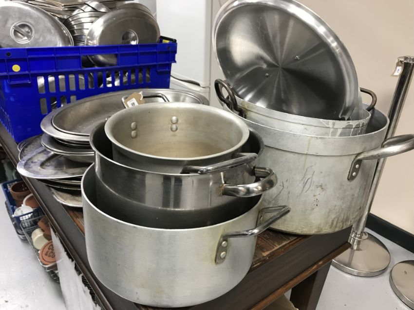Five stainless steel cooking pots with lids (odd)