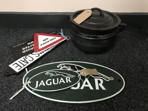 A cast iron three leg pot with lid, two cast plaques - Jaguar and three other signs