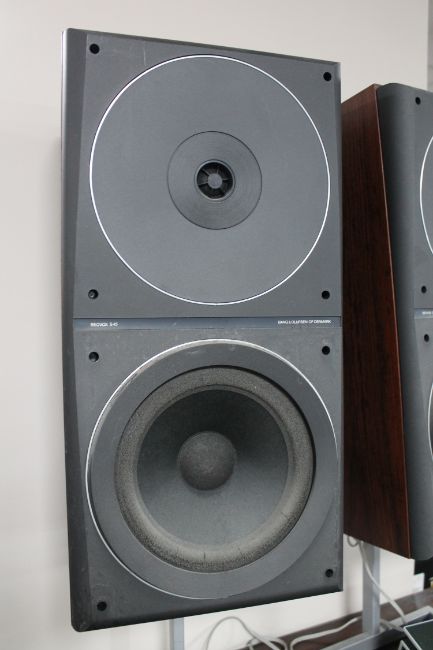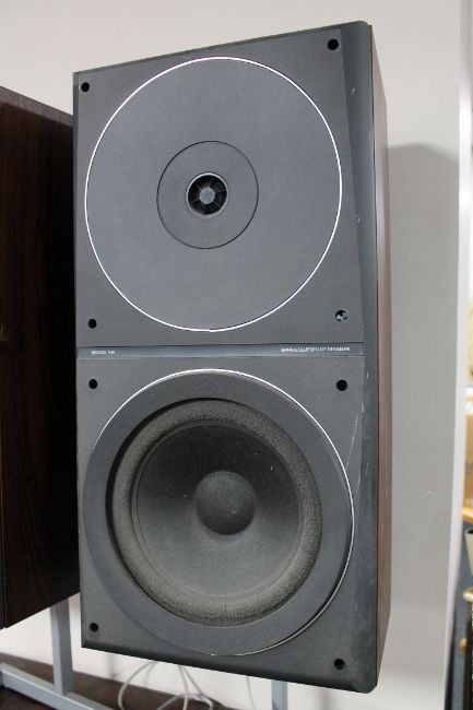 A pair of Bang and Olufsen Beovox S45 speakers on stands