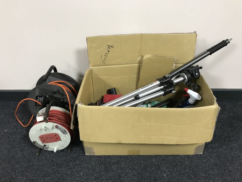 A box of hand tools, fire extinguisher, camera tripod, together with two extension leads