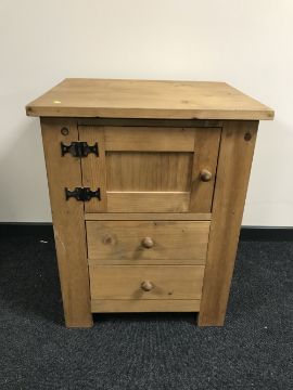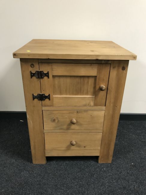 A striped pine cupboard fitted with two drawers
