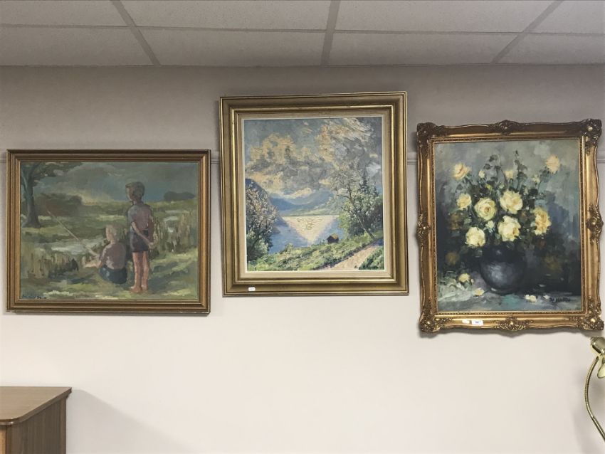 A gilt framed continental school oil on canvas, together with a gilt framed oil on canvases, figures fishing by a river, and a another oil depicting a rural landscape