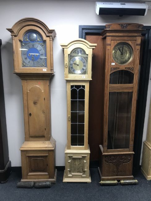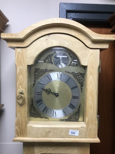 A blonde oak cased Tempis Fugit long case clock, no pendulum or weights
