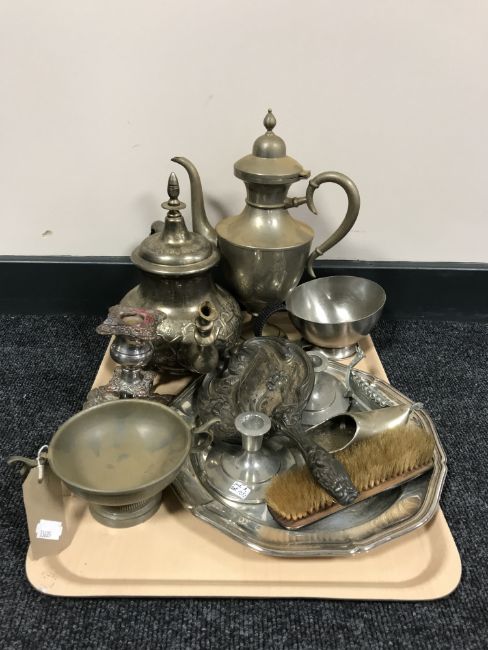 A tray of twentieth century plated ware including teapots, candlesticks, deco hand mirror etc