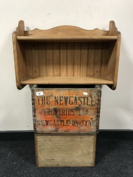 A vintage Newcastle Breweries wooden beer crate together with a small pine box and a pine wall shelf