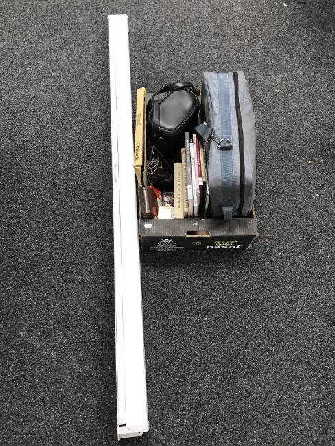 A box of books relating to photography, cameras and a pull down projector screen