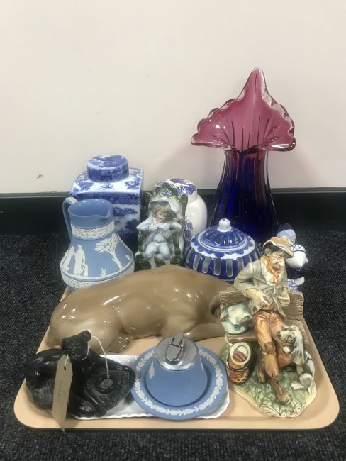 A tray containing decorative glass vase, blue and white Wedgwood jasperware, Ringtons caddies, ornaments etc
