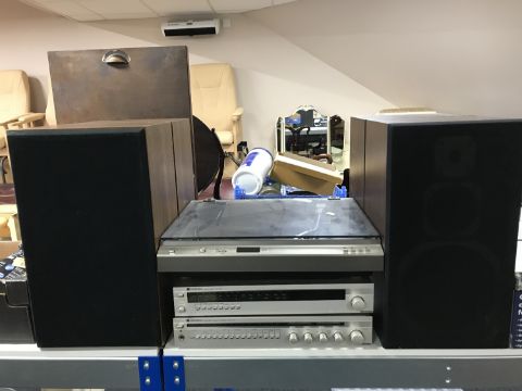 An Optonica turn table stereo tuner and amplifier, a pair of Triumph LS300D speakers and a pair of Toshiba speakers