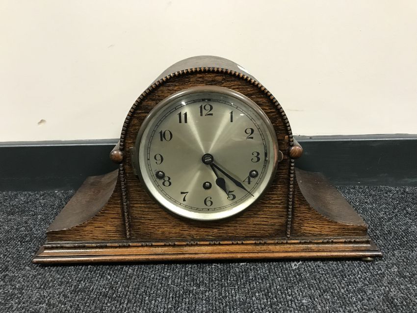 An oak mantel clock with silvered dial