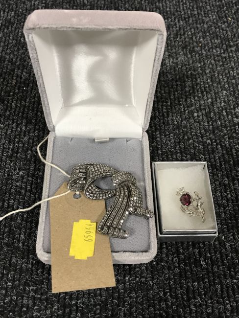 A silver marcasite brooch together with a brooch of a thistle