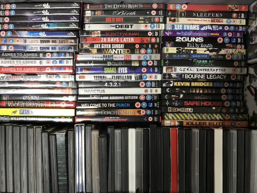 Two luggage cases and a crate containing approximately 200 DVD's and box sets