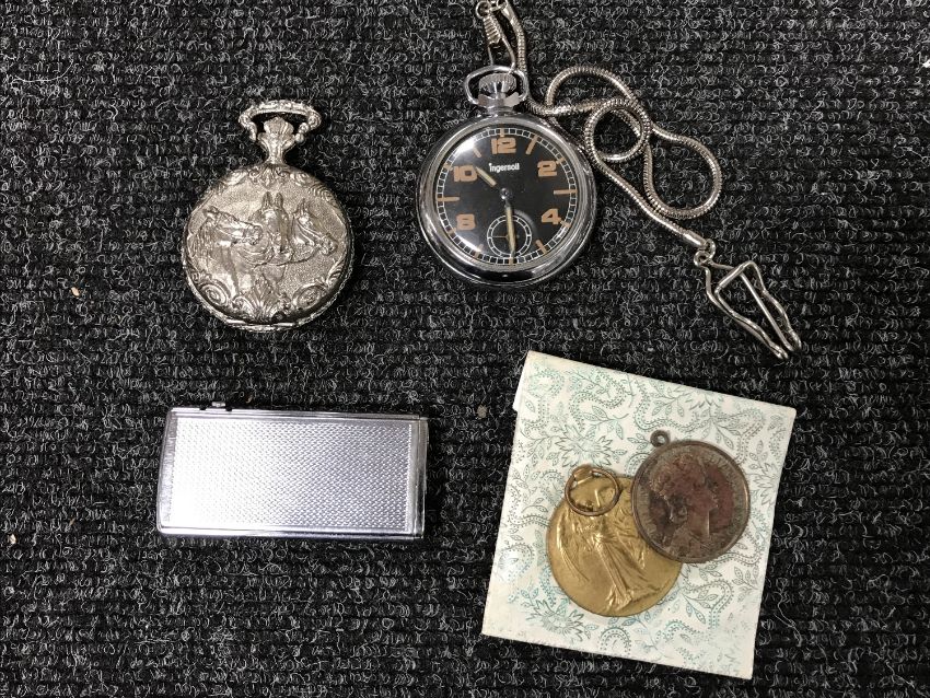 A WWI Victory medal named to PTE. T. Hoban Durham Light Infantry, together with a 1953 Coronation medal, a Ronson lighter, Ingersoll pocket watch and a Flextime pocket watch