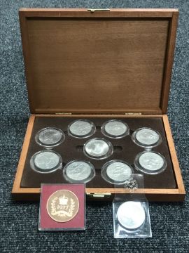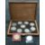 A coin box containing nine commemorative crowns and two other coins