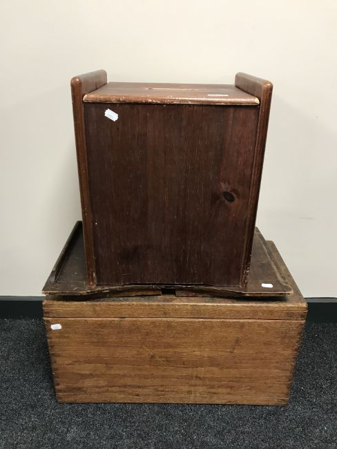A folding bed tray, a small pine blanket box and a pine storage seat. (3)