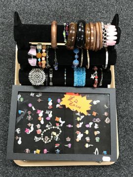 A tray of bracelet display stand and bracelets, ring display display case and a quantity of fashion rings