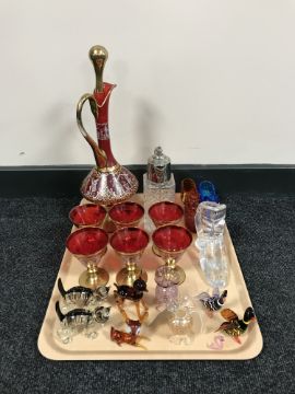 A tray of glassware including deer, duck and cat ornaments, red glass and gilt liqueur decanter and glasses, glass shoes etc