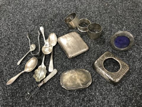 A box of assorted sterling silver items including cigarette case, photo frame, jar lid, napkin rings, tea spoons, sugar tongs (14 pieces)
