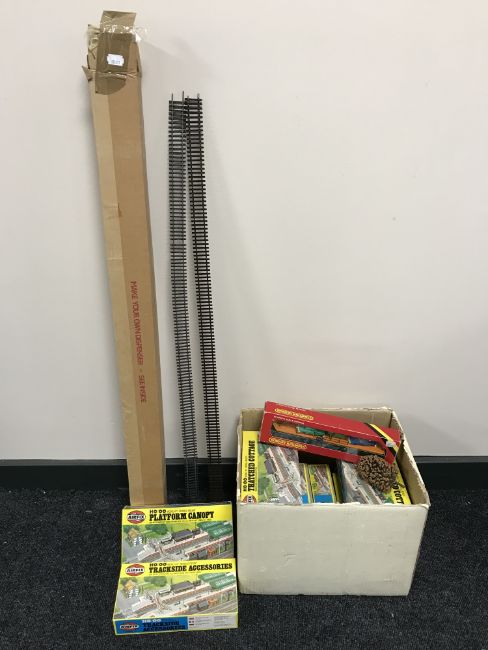 A box of Airfix HO/OO gauge boxed plastic modelling kits, Hornby Railways OO gauge transporter and a box of track