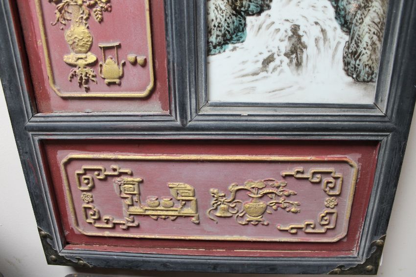 A hand painted Chinese porcelain panel in wooden frame