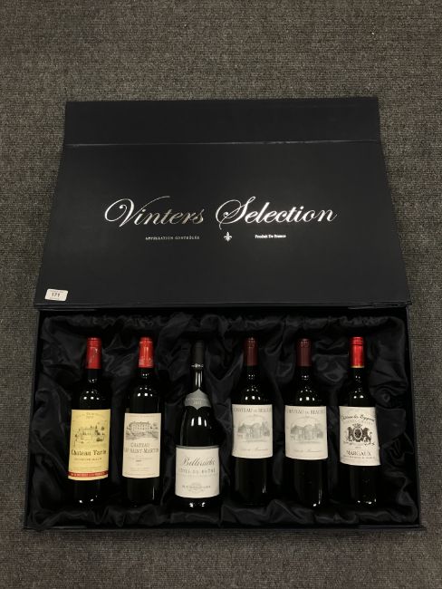 A cased presentation set of six bottles of wine 'The Vinters Selection' - Chateau Taris 2011, Chateau cap san martin 2011, Cotes du Rhone M Chaputier 2012, Chateau du Beaulieu 2006 (2), and Margaux Chateau les eyquen 2013. (6)
