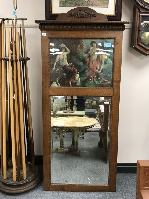 A late Victorian oak framed picture mirror, depicting maidens by a river, 70 cm x 169 cm.