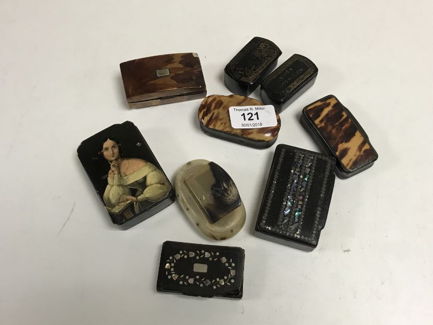 A collection of nine 19th century snuff boxes including examples in tortoiseshell, horn, lacquer etc. (9)