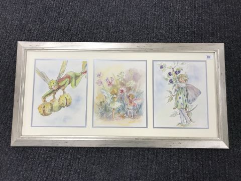 Late Twentieth Century School : Flower Fairy with Prickly Chestnuts, an original illustrator's study in watercolour, 31 cm x 24 cm, together with two similar by the same illustrator both also depicting Flower Fairy subjects, framed overall as one.