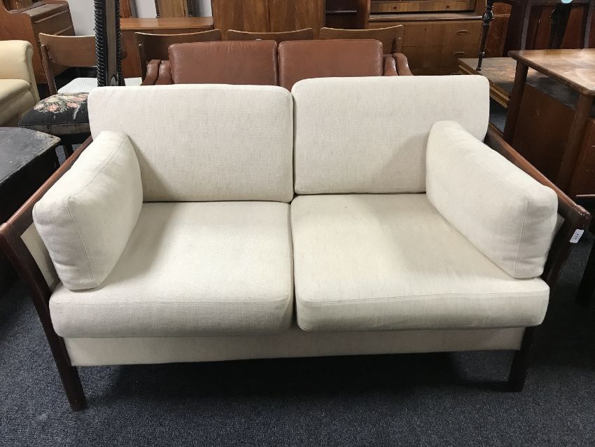 A continental two seater settee upholstered in oatmeal fabric by Friis, width 144 cm