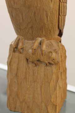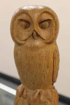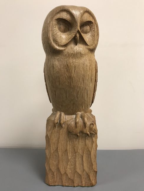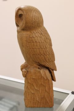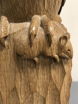 A Robert 'Mouseman' Thompson of Kilburn carved oak owl, carved as a perched owl holding a mouse in its talon upon a rockwork base, height 32cm CONDITION REPORT: There is a fine, natural fissure/crack running through the owl's left wing. Generally in excellent condition. See images. Circa 1980's. This lot can be packed and posted within the UK for £20. All lots are sent without insurance and at the buyer's risk.