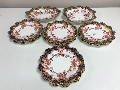 Fourteen Royal Crown Derby cabinet plates, pattern 4964. (14) CONDITION REPORT: All in good condition but with noticeable wear to the gilding.The one oval plate is 27.5cm wide. The one square plate is 25.5cm wide. The remaining circular plates are 22cm wide.