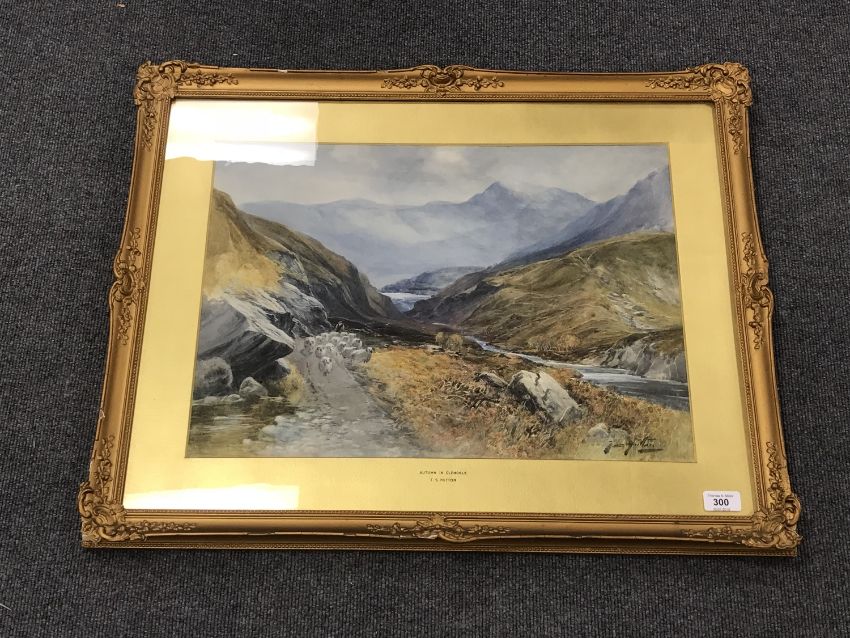 Thomas Swift Hutton (c.1865-1935), Autumn in Glenogle, a shepherd driving sheep through a valley, watercolour, 54cm by 40cm, signed.